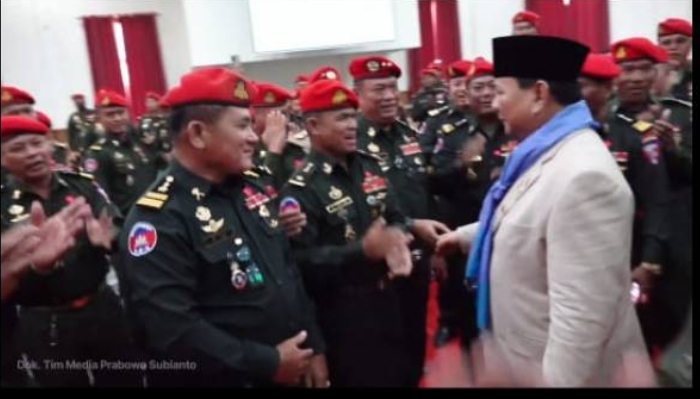 Pekik “Komando” dan yel-yel Kopassus pun bergema saat Prabowo disambut di Markas Kopassus Kamboja tersebut.