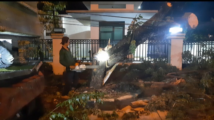 Batang pohon yang menutup jalan baru dievakuasi, setelah tim Dinas Pertamanan kota Medan datang ke lokasi untuk melakukan evakuasi dengan cara memotong bagian-bagian pohon agar akses jalan bisa kembali dilalui dan akhirnya memotong seluruh pohon yang tumbang tersebut.