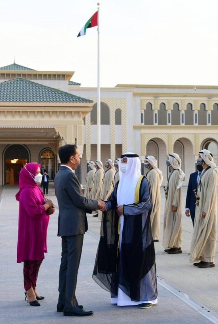 Selama berada di Abu Dhabi, Jokowi melakukan pertemuan dengan Presiden PEA Sheikh Mohamed bin Zayed bin Sultan Al Nahyan di Istana Al Shatie.
