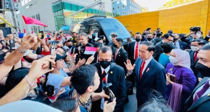 Presiden yang melihat banyaknya antusias masyarakat langsung turun dari mobil dan menyapa masyarakat.