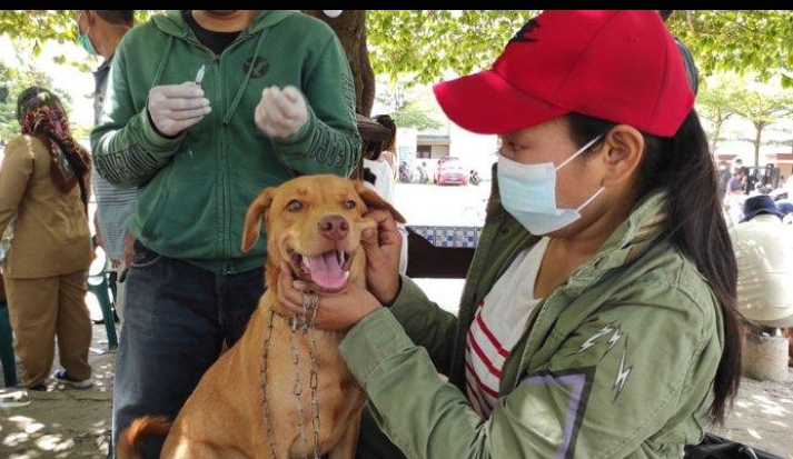 Kompastalk.co-Seorang warga sedang memegang anjing peliharaannya dalam proses vaksinasi massal hewan yang dilakukan Kelurahan Mangga, Kecamatan Medan Tuntungan. Senin (28/6/2021).