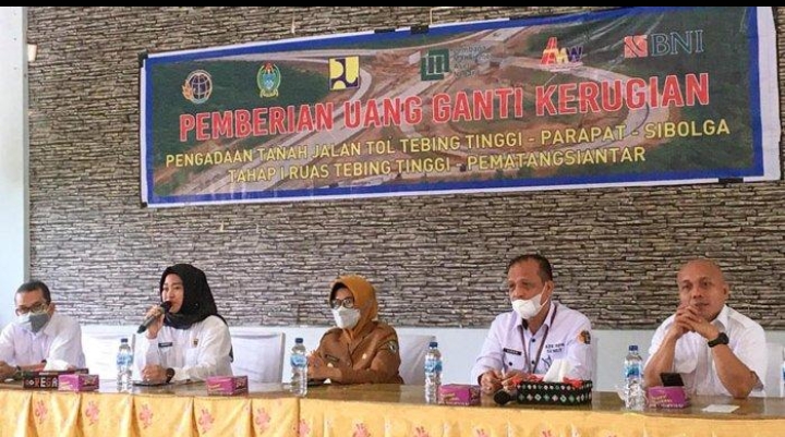 Penyerahan ganti-untung lahan dalam upaya mendukung Program Strategis Nasional yakni pengembangan pembangunan Jalan Tol Trans Sumatra (JTTS) tersebut, dilaksanakan di Pondok Bagelen, Kecamatan Tebingtinggi Kota, Kota Tebingtinggi, Selasa (21/6/2022) pagi.