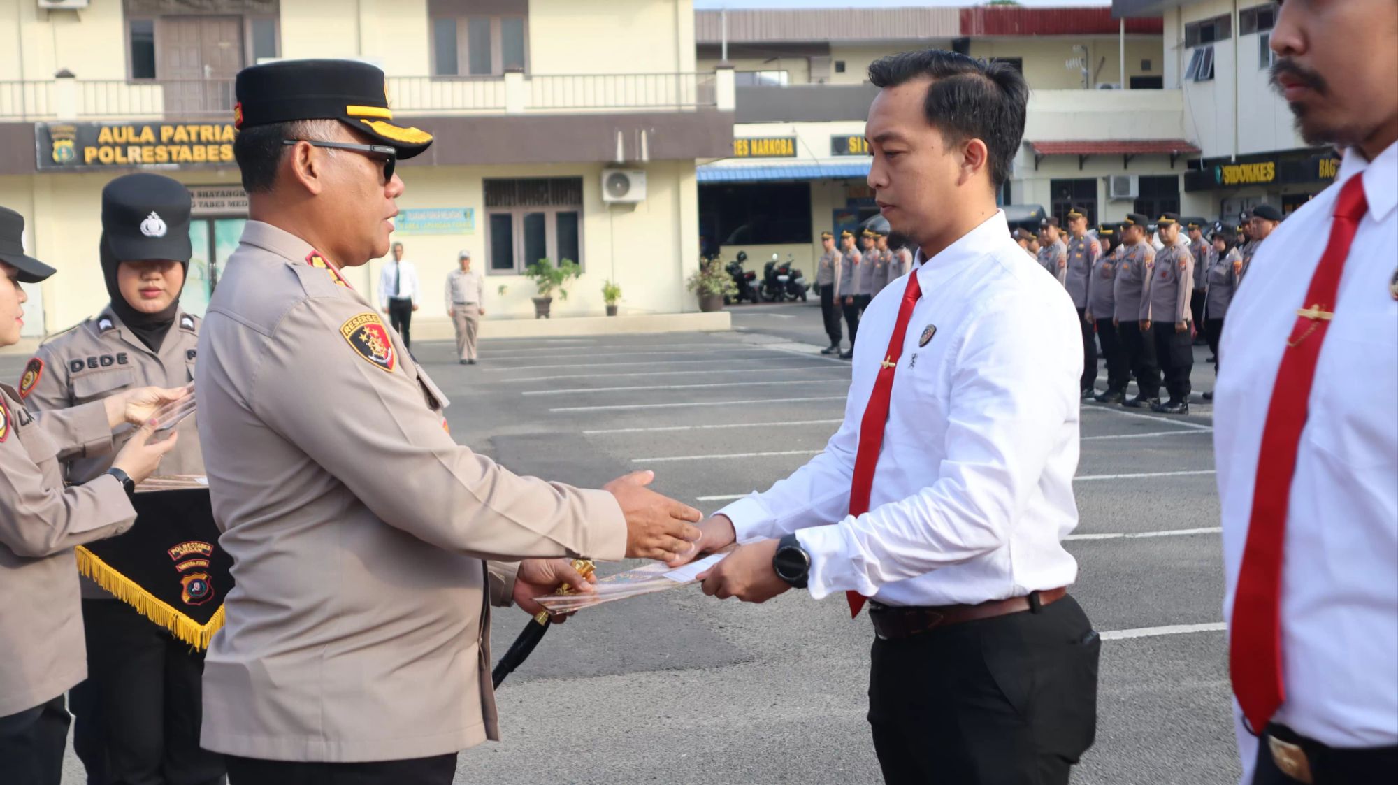 Apel pagi kali ini dirangkai dengan pemberian reward atau penghargaan kepada 27 personel Sat Narkoba Polrestabes Medan dan Polsek Sunggal yang berprestasi dalam tugas.