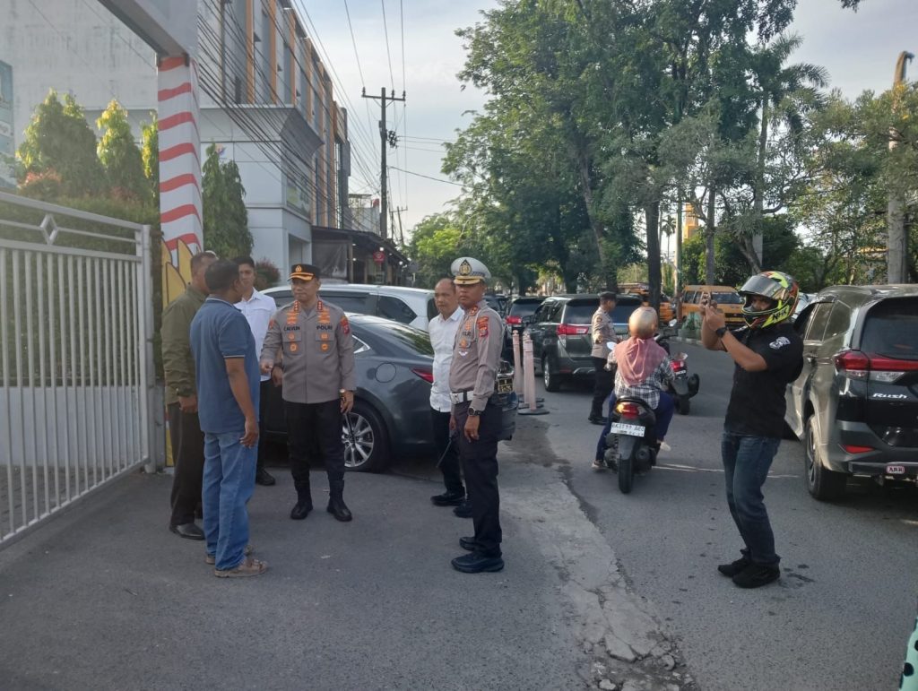 Medan – Kapolrestabes Medan, Kombes Pol. Calvin Simanjuntak, bersama Kasat Lantas Polrestabes Medan dan personel Polsek Medan Kota, melakukan inspeksi mendadak (sidak) di depan Sekolah Global Prima Medan, Jalan Brigjen Katamso, Kecamatan Medan Maimun, Kota Medan, Senin (13/10/2025).