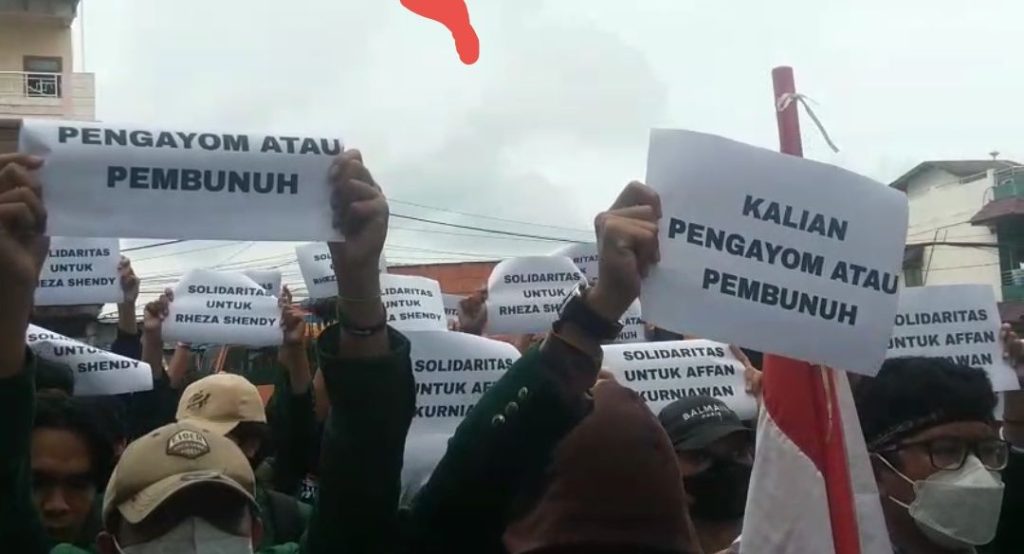 Mengenakan almamater kampus, massa aksi membawa berbagai poster bertuliskan ‘Solidaritas untuk Affan Kurniawan’, ‘Kami Demonstran Bukan Anarko’, dan ‘Kalian Pengayom atau Pembunuh’.