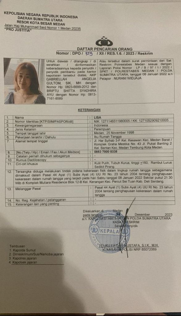 Kompastalk.co,Medan – Sumatera Utara, Satreskrim Polrestabes Medan unit PPA berhasil mengamankan Daftar Pencarian Orang (DPO) kasus tindak pidana kekerasan dalam rumah tangga Pasal 44 ayat (1) Subs ayat (4) UU RI.No 23 Tahun 2004. Pelaku,Lisa (25) di amankan ketika sedang berada di bandara Kualanamu Deli Serdang Sumatera Utara.Sabtu (24/2/2024) siang.