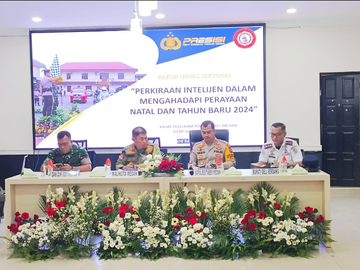 Polrestabes Medan menggelar rapat koordinasi (rakor) lintas sektoral bersama stakeholders untuk persiapan pengamanan kegiatan Natal dan Tahun Baru 2024. Rakor itu dipimpin Kabag Ops Polrestabes Medan AkBP Yasir Ahmadi SIK MH bertempat di Aula Patriatama Polrestabes Medan, Kamis (21/12/2023).