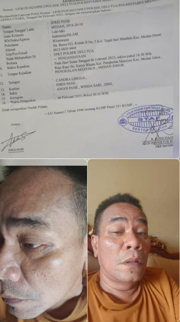 “Ada sekitar 80 orang saat itu dibawa CL ke lokasi usaha saya. Karyawan saya pada ketakutan. Sementara saya sampai saat ini mengalami trauma. Bahkan, pandangan saya sampai saat ini masih kabur-kabur akibat penganiayaan itu,” sebut Idris seraya menunjukkan Laporan Polisi Nomor : LP/B/95/II/2023/SPKT/SPKT/POLSEK DELI TUA/POLRESTABES MEDAN/POLDA SUMUT.