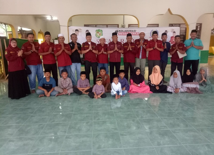 Kegiatan Safari Ramadhan 1444 Hijriyah DPD LPM Kota Medan, DPC LPM serta LPM kelurahan di kecamatan Medan Marelan ini sekaligus berbuka puasa bersama dan dalam rangka berbagi bantuan sembako kepada 15 anak yatim dari warga sekitar masjid Jami’ Nurul Huda.