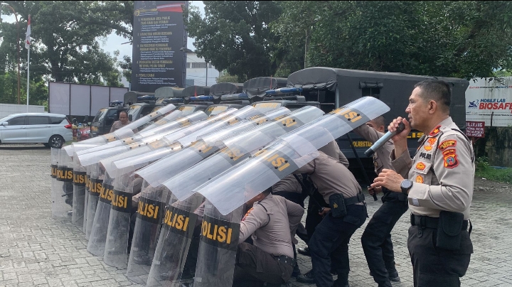 Sat Samapta Restabes Medan gelar latihan pengendalian massa (Dalmas) di halaman Markas Samapta Restabes Medan Jalan Putri Hijau, Rabu (11/10/2023).