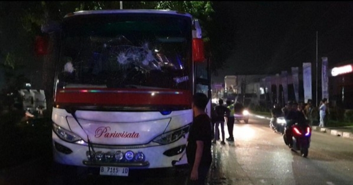 Akibatnya bus pariwisata itu pun diamuk massa hingga rusak. Kaca bus pecah dan berserakan di jalan