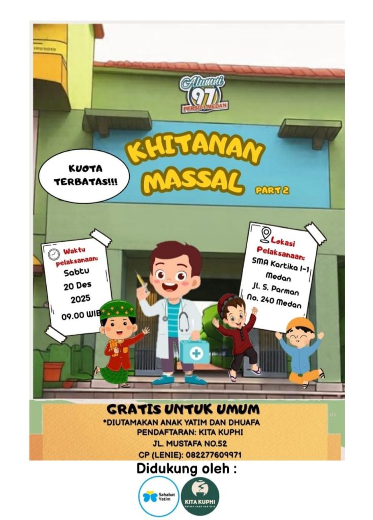Adapun kegiatan Sunat Massal Part 2 Alumni Kartika I-1 Medan ’97 akan dilaksanakan pada Hari, Sabtu 20 Desember 2025 di SMA Kartika I-1 Medan, Jalan S. Parman No. 240 Medan